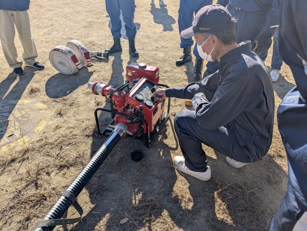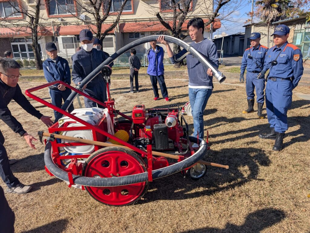長森西市民消火隊が所有するポンプ車を用いて参加者が実際に放水までの手順をひとりひとり確認して非常時に備える事ができました