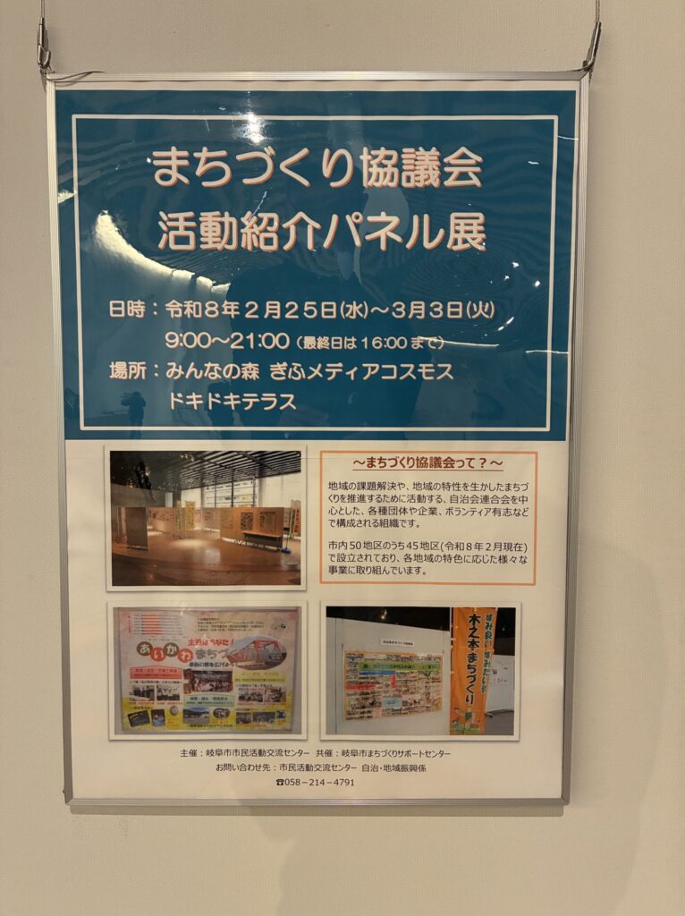 このパネルは「令和7年度まちづくり協議会活動パネル展」(場所 みんなの森 ぎふメディアコスモス1階 ドキドキテラス)にて3月3日まで掲示されています